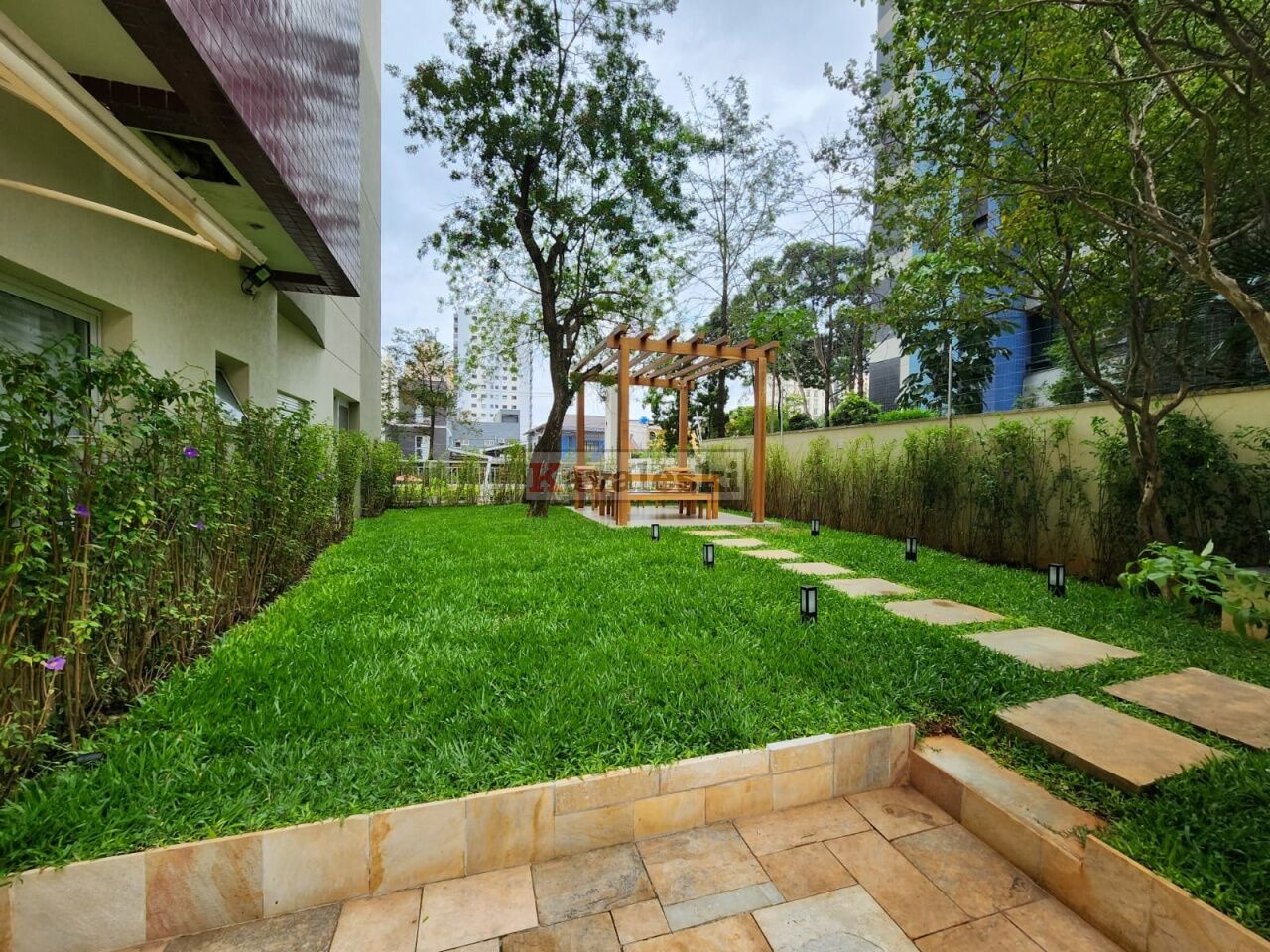 Área gramada com banco para leitura ou descanso;