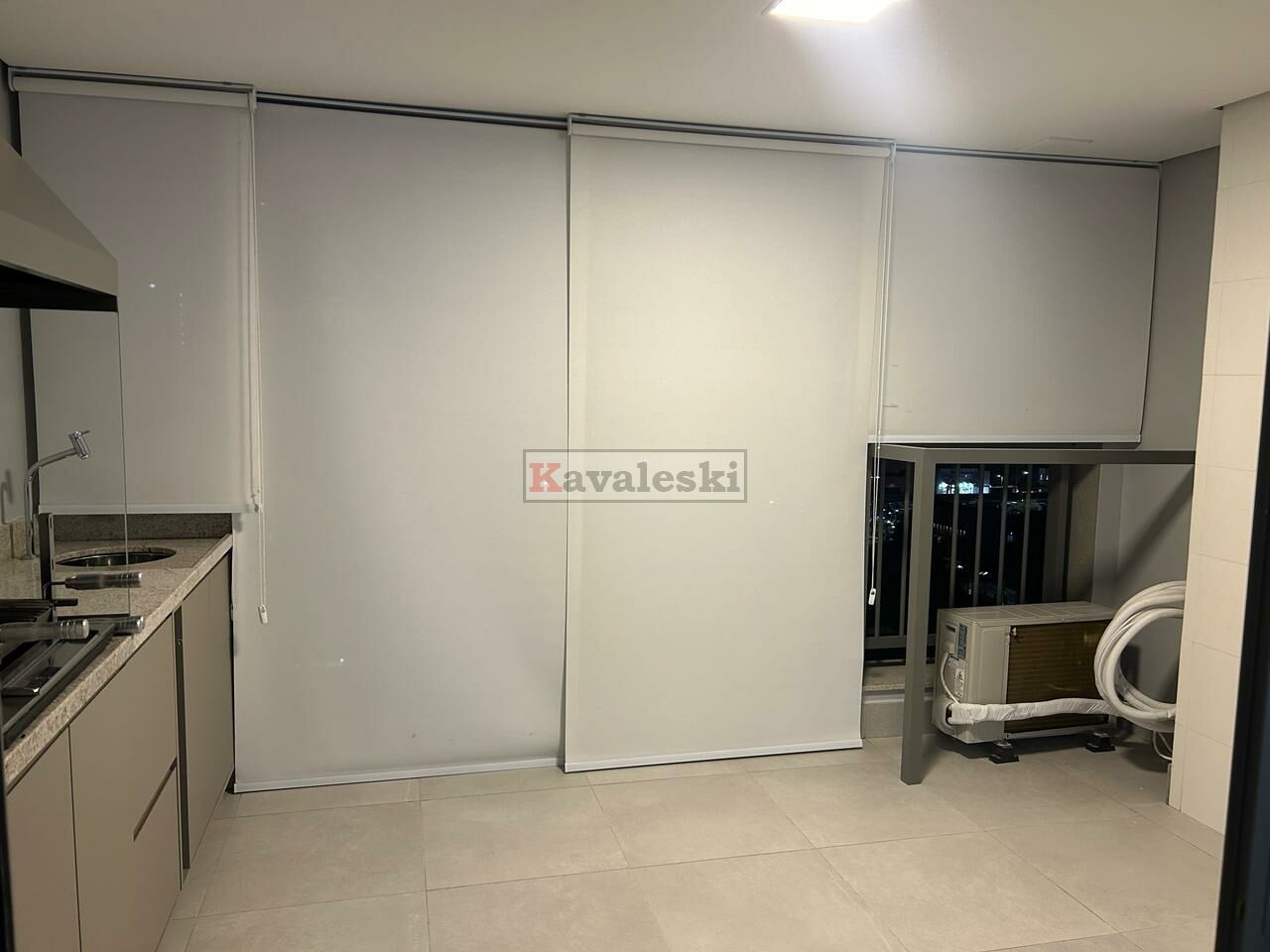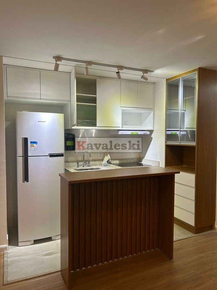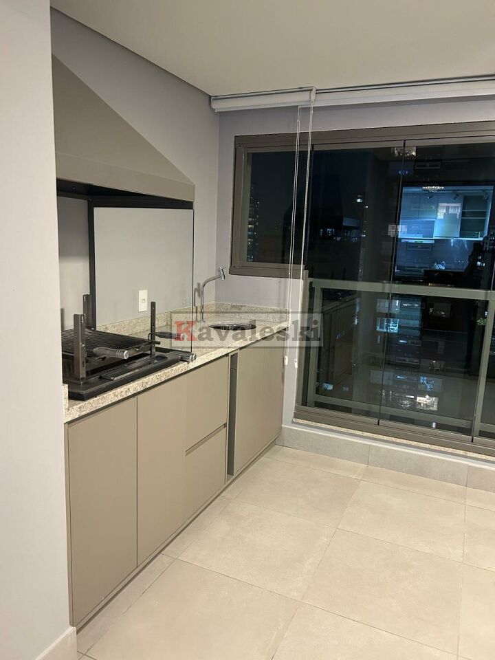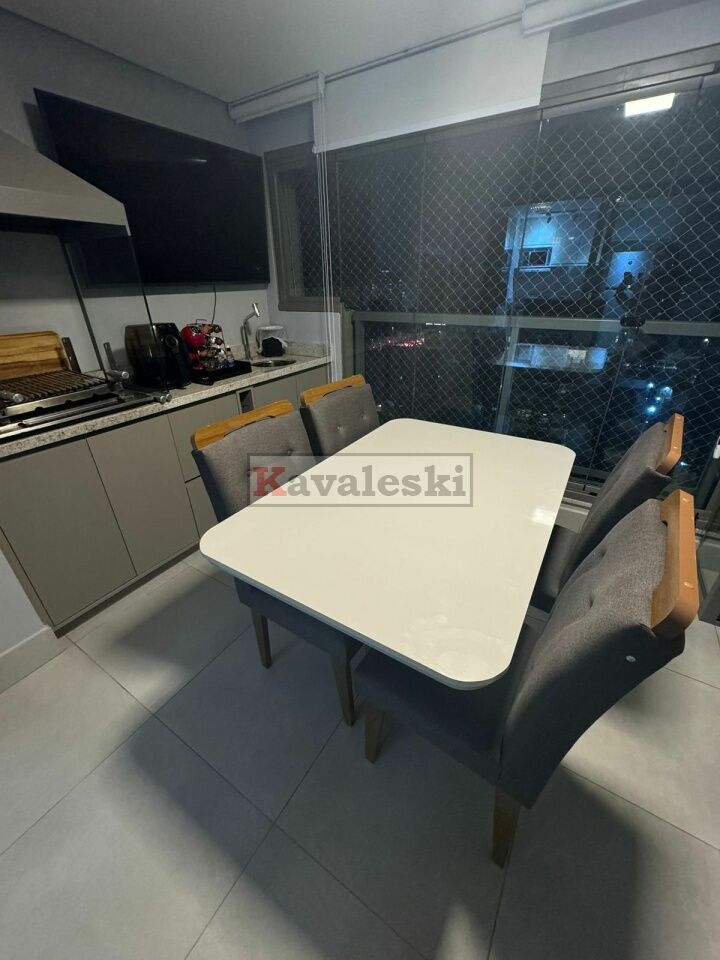 instalados: piso, gás para aquecimento de água da cozinha e dos banheiros, chuveiros, box, espelhos; todo climatizado ar condicionado na suite, quarto, sala; armários em suíte, quarto, banheiros, cozinha, lavanderia e área gourmet; camas de casal em suíte e quarto; bancada em cozinha semelhante americana, cooktop, forno embutido, sugar, microondas, geladeira, rack com painel e sofá retrátil/reclinável/box em sala; rebaixamento de teto e iluminação; mesa na área gourmet e máquina de lavar e secar roupas na lavanderia isolada por armário, Envidracamento, proteção solar, armários (inclusive isolando a lavanderia) na área gourmet com churrasqueira. Gás e água individualizados.