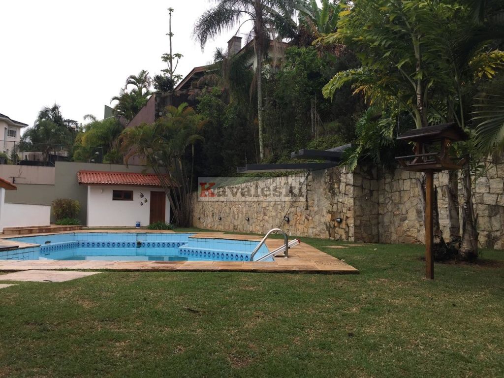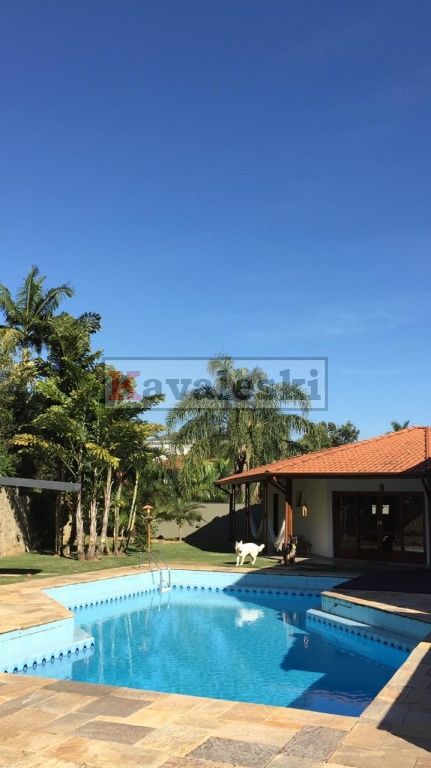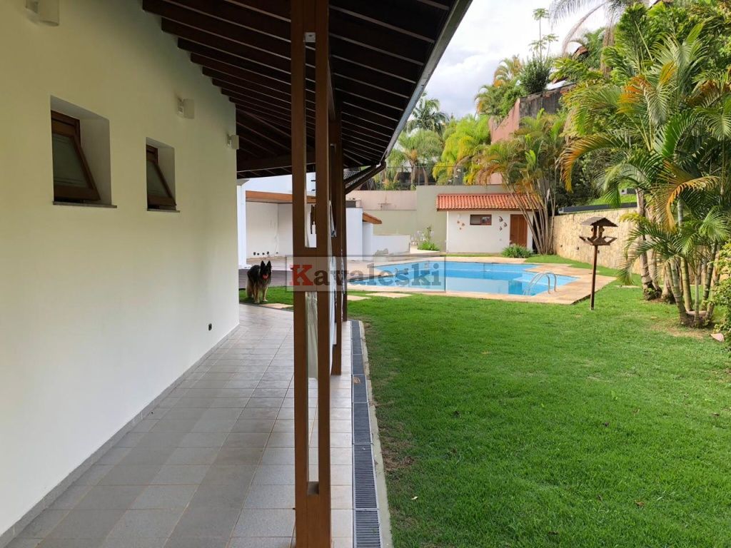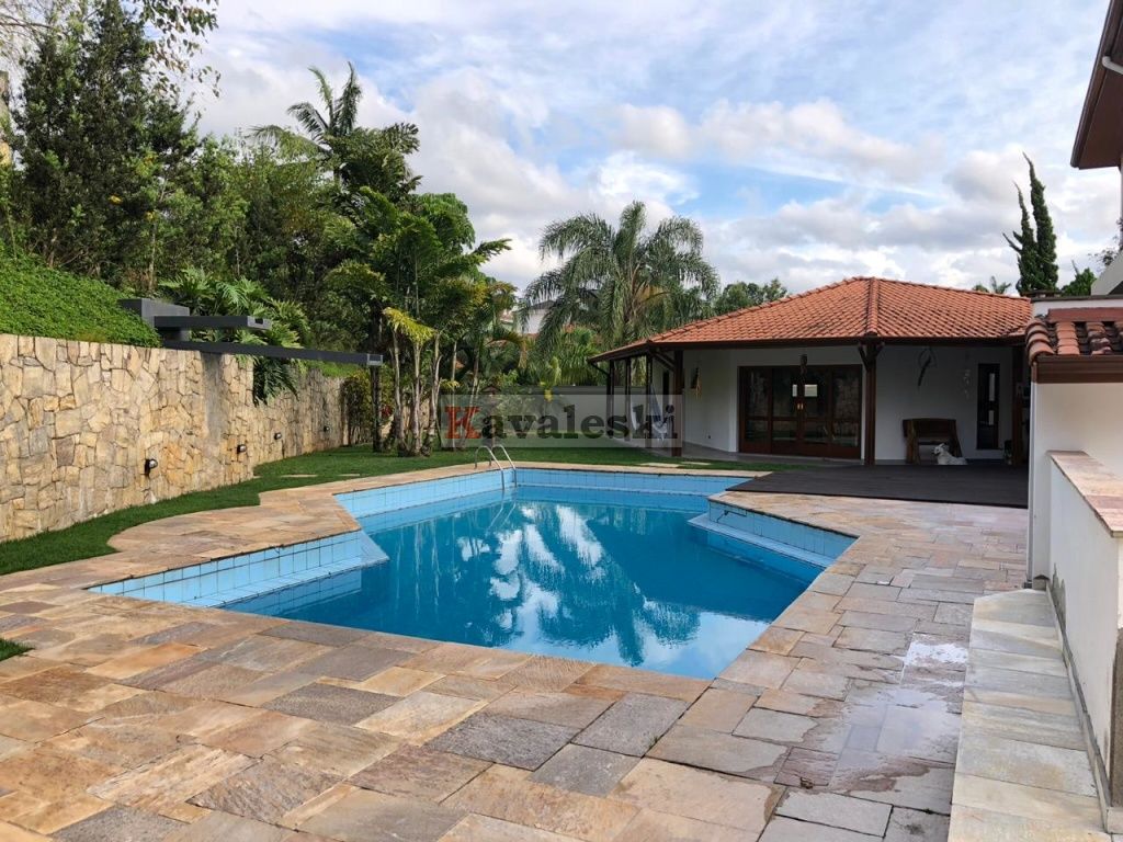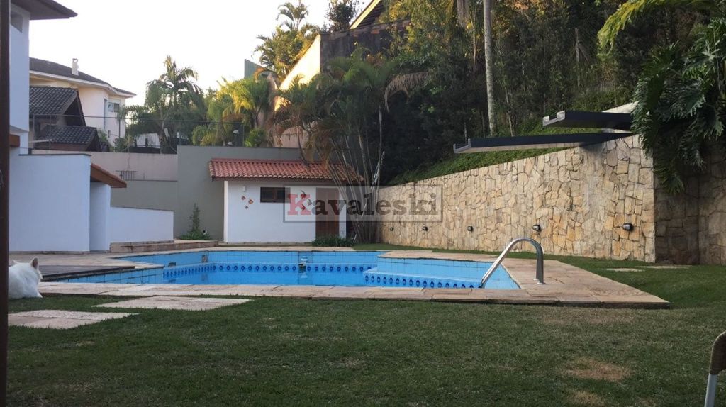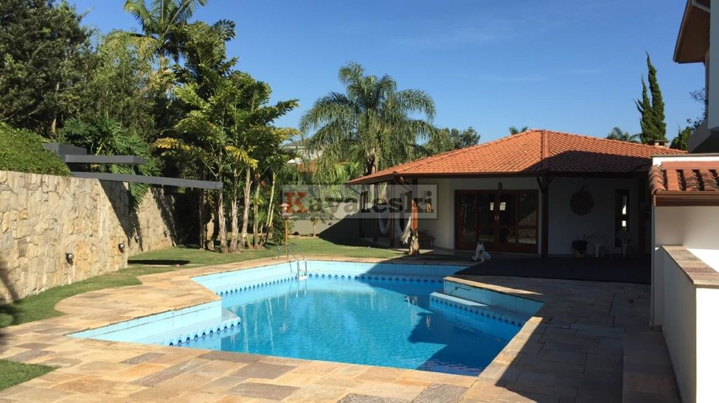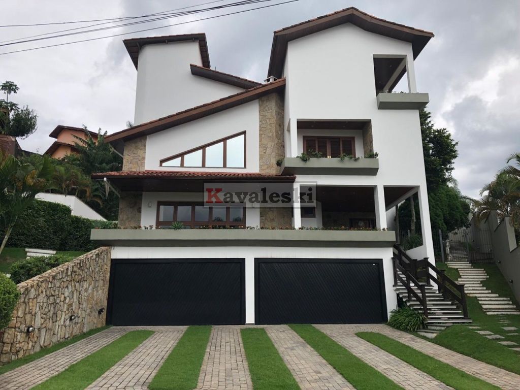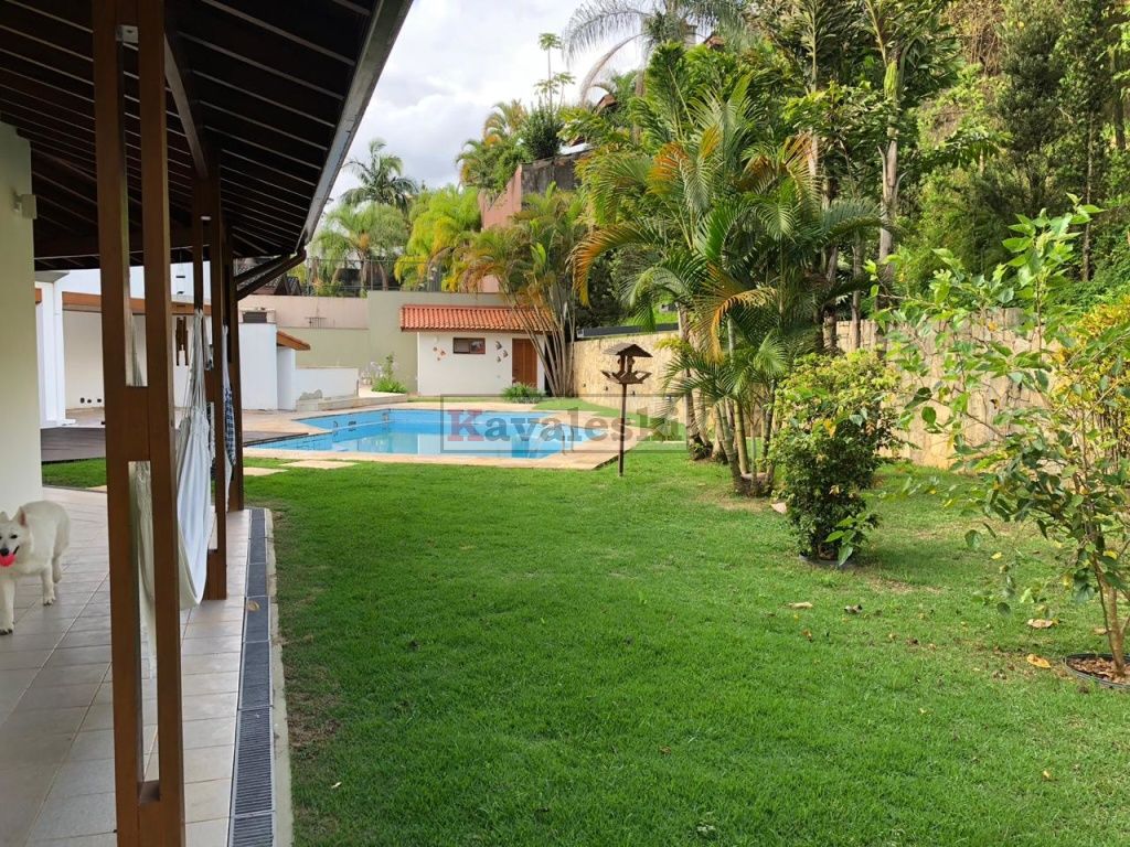 Linda e imponente casa em final de rua tranquila instalada em 1260m2 de terreno. Com 722m2 de construção sólida de parede dupla externa e interna a casa possui caixilharia e metais de primeira qualidade e muita madeira. Aquecimento solar. Garagem coberta e fechada para 4 carros, com entrada independente à casa, banheiro mais 4 vagas externas. 3 entradas independentes à residência: entrada social, lazer e serviço. Aconchegante sala de lareira com pé direito duplo. Lindo lavabo estilo provençal. Sala de jantar ampla e iluminada com vista para seu jardim. Cozinha muito bem iluminada repleta de armários com pia dupla, bancada, despensa própria e sala de almoço. Lavanderia repleta de armários, tanque duplo e local para instalação de até 2 máquinas de lavar. Prático anexo para empregado(s) com 2 cômodos, cozinha e banheiro completo com chuveiro. Ampla sala de TV com acesso à área de lazer. Escritório prático e espaçoso. 4 quartos sendo o primeiro a suíte máster com closet, hidromassagem e jardim de inverno, uma segunda suíte com hidromassagem e outras duas semi-suítes igualmente com hidromassagem. A área de lazer é composta por piscina com sua ampla casa de bombas, espaço gurmet com churrasqueira e forno iglu contígua ao salão de jogos, cozinha equipada com armários, despensa, 1 lavabo e um segundo espaço contíguo composto por uma com sauna seca, vestiário e um banheiro completo. A casa é muito silenciosa e ao mesmo tempo possui uma excelente acústica nos ambientes devido ao pé direito duplo das salas, sendo que a sala da lareira aquece também a sala de TV. Todos os quartos possuem sacadas e uma excelente vista permanente ao condomínio e a natureza do entorno, sendo que a suíte máster possui vista para toda a área de lazer.