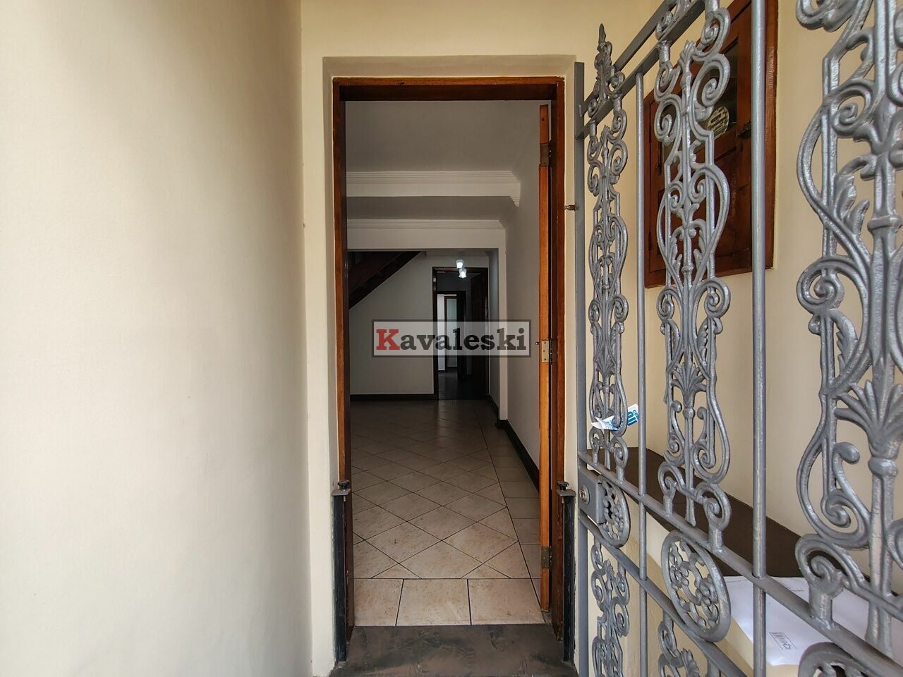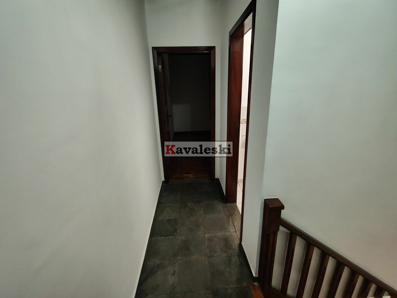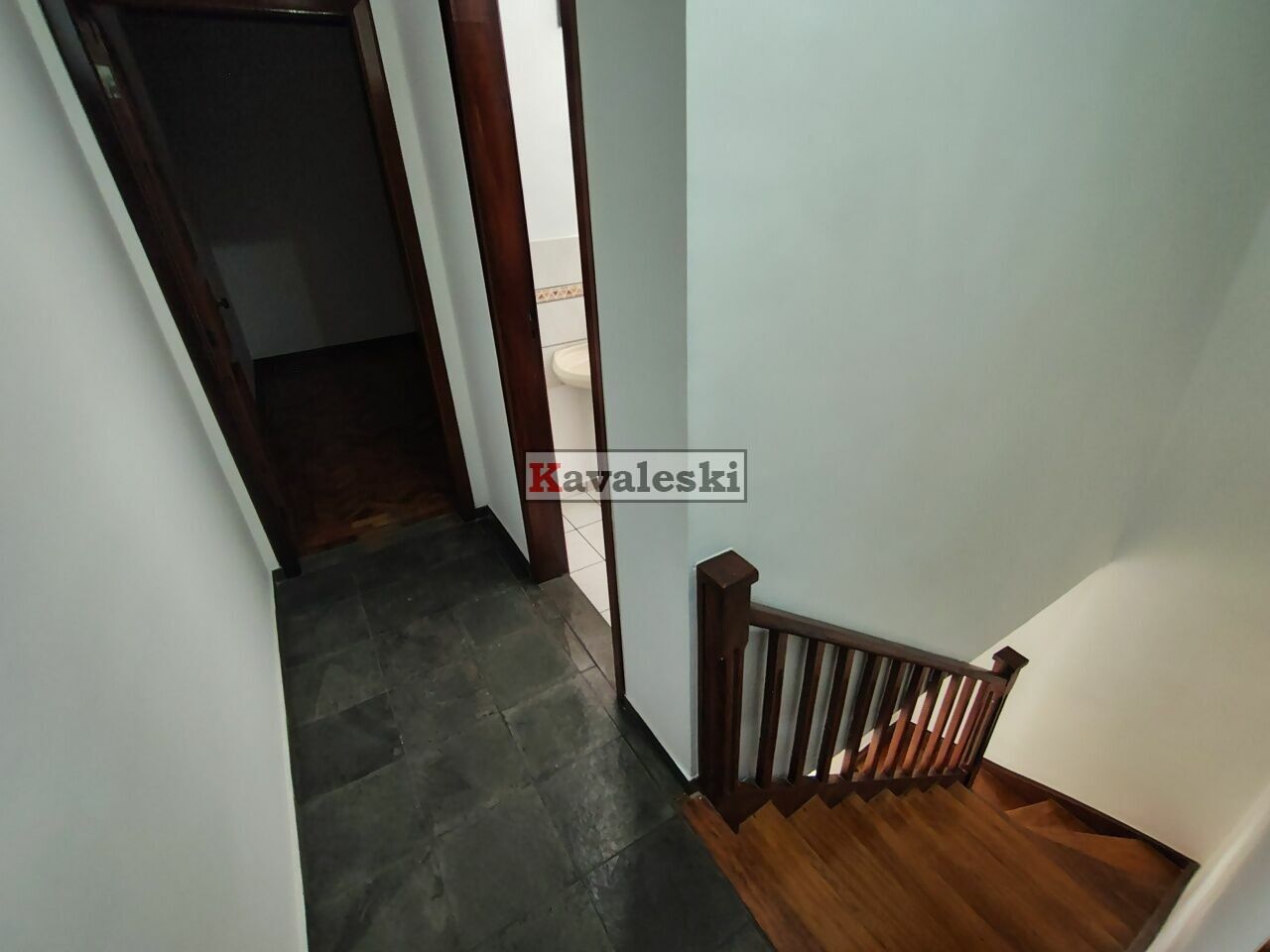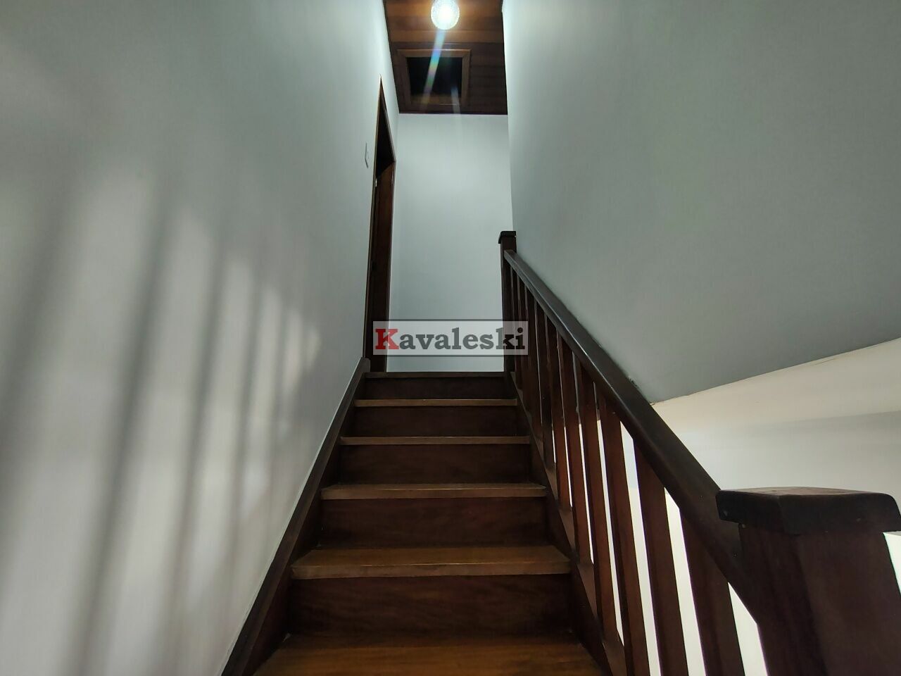 No acesso para o piso superior há uma escada de madeira linda.