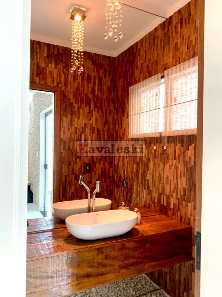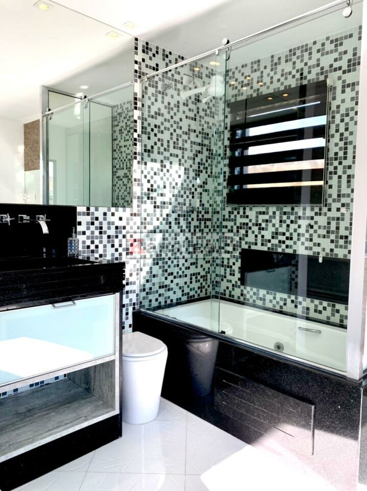 1 suíte com sala de banho integrada com banheira, armário (porta de vidro serigrafado branco) e home theater, cabeceira toda revestida em madeira gris (prata) da Oca Brasil Revestimentos, com grande espelho e duas arandelas (iluminação em led).